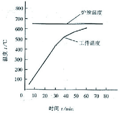 由于該工件厚度較厚,體積較大,采用硬加熱規范,把爐膛溫度預置到650℃,然后把安置好釬料和釬劑的工件放入爐膛進行加熱,待工件溫度上升到600℃即可出爐冷卻。圖3為爐膛和工件溫度與時間的變化曲線。2.3 焊后清洗  釬焊后的工件在20%左右的硝酸溶液中清洗,可以得到滿意的清洗效果。